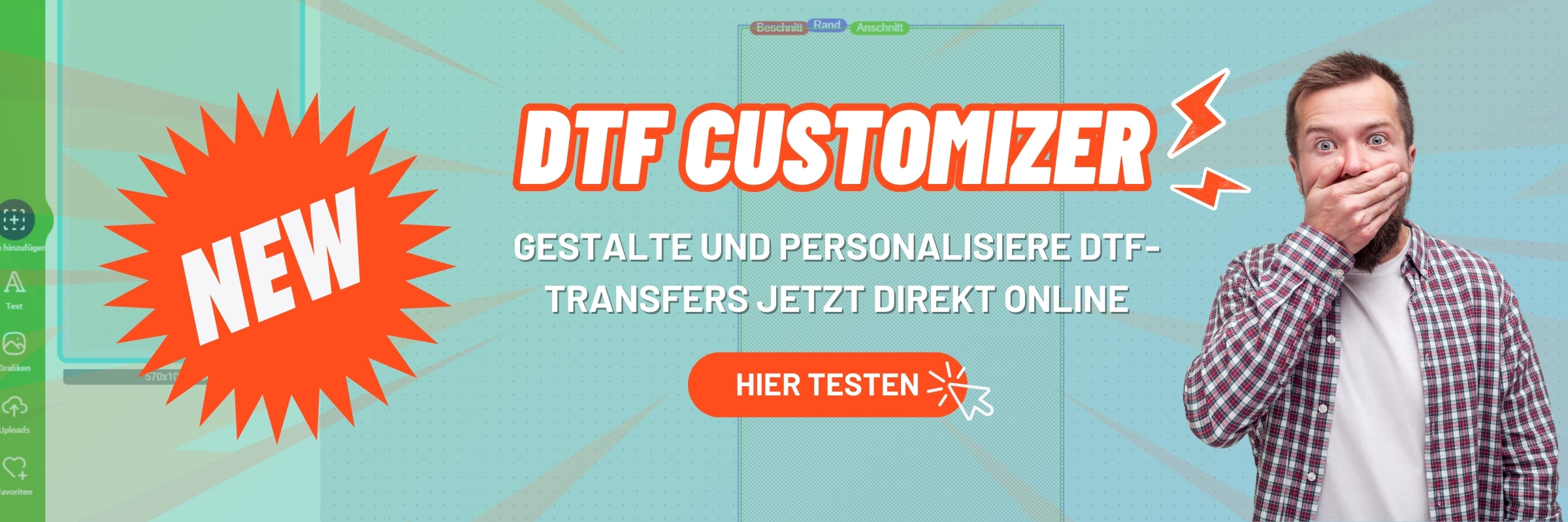DTF ist die Abkürzung für „Direct-to-Film“, was soviel wie „Direktdruck auf Folie“ bedeutet. Das DTF-Verfahren ist eine Drucktechnologie auf Tintenbasis und ermöglicht es, farbige Motive und Logos für den Transfer auf Textilien zu drucken. Unter Einfluß von Hitze und Druck wird das Motiv dann von der Folie auf das Textil transferiert. Wir empfehlen ca. 30 Sekunden bei 125 Grad, je nach Stärke des Materials und Andruck der Transferpresse kann der Zeitraum variieren.